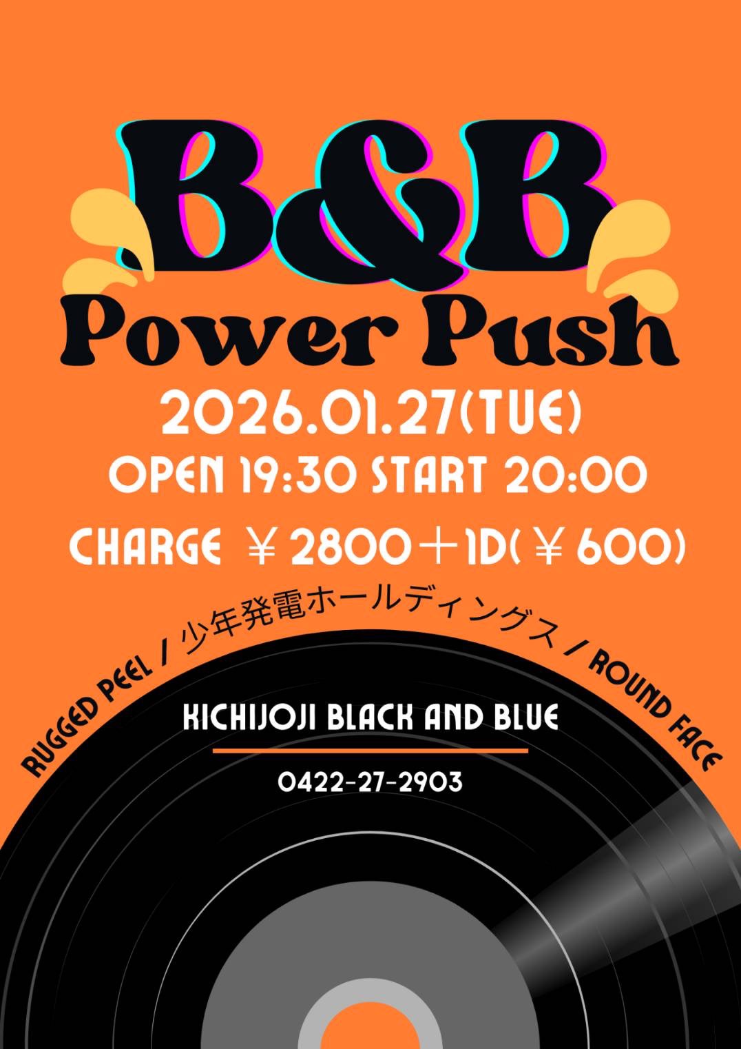 B&B Power Push date26/01/27 place吉祥寺Black and Blue op/st19:30 / 20:00 ticket¥2,800+1Drink 詳細 20:00-20:35 RUGGED PEEL 20:45-21:20 少年発電ホールディングス 21:30-22:05 Round Face